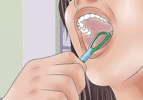 Scrape your tongue. Place the scraper at the back of your tongue and apply gentle pressure. Pull the scraper forward to the front of your tongue. Repeat as needed. Make sure you don’t place the tongue too far back or you will gag.