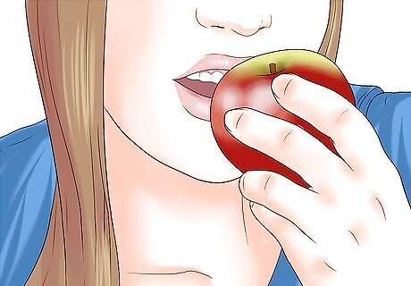 Use a “natural” toothbrush. Eat a raw apple, celery, or carrot to mimic the effect of brushing your teeth. These fibrous foods are crisp enough to remove food particles from your teeth. They also encourage your mouth to produce saliva, which helps keep your mouth moist and removes bacteria.