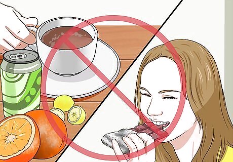 Avoid acidic foods. Limit the amount of acidic foods you eat. This includes citrus fruits, coffee, chocolate, soft drinks and spicy foods. Acidic foods can cause acid reflux, which contributes to bad breath. Take an over-the-counter antacid medication and don’t lie down directly after eating if you cannot change your diet.