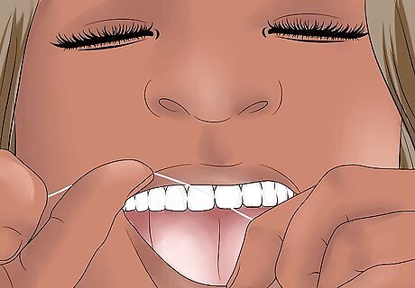 Floss. Cut a piece of floss about 18 inches (46 cm) long. Wind part of the floss around one of your left fingers and part of the floss around one of your right fingers. Leave about 1 inch (3 cm) of floss in between. Place the floss in between your teeth and gently scrape off the plaque. Rub the floss all the way from the gumline to the top of the tooth. Change positions of the floss for each tooth.