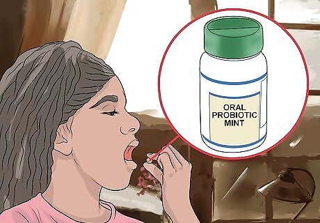 Eat an oral probiotic mint. Reach for a probiotic mint instead of a normal mint. Probiotics contain live microorganisms that are normally used to help maintain a healthy stomach, but research shows that probiotic mints may also help kill bad-smelling bacteria in your mouth. The mints are small and easy to carry and function as a simple substitute for regular mints.