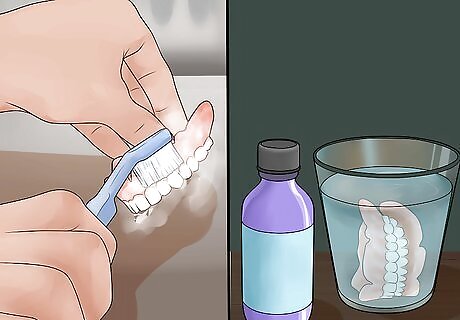Clean your dentures. Use a soft-bristled brush and fluoride toothpaste to remove food particles from your dentures. Use the same techniques as you would when brushing your teeth. Soak your dentures in a denture solution overnight to remove plaque deposits and thoroughly clean your dentures.