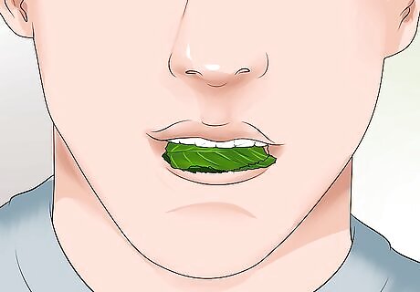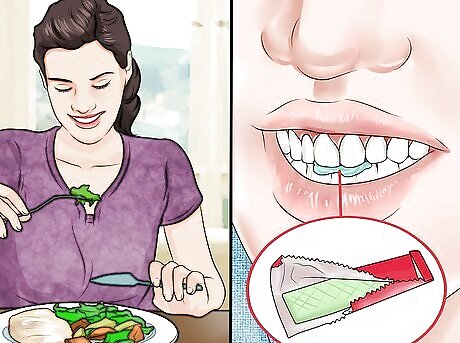 Chew a fresh mint leaf. Keep a small bag of fresh mint leaves in your bag or purse so you have something to chew on after meals. You can substitute parsley for mint, if you like. Neither will provide long-lasting effects, but they’re great for a quick and natural on-the-go fix.