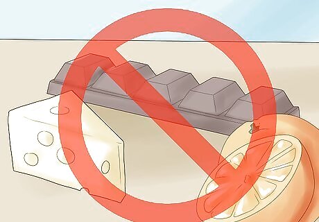 Avoid triggering foods. Study which foods may be triggering your migraines. In some cases, migraines have be reduced 30 – 50% by removing all triggers from the diet. You should try to identify a migraine-trigger food before you eat it. Find out triggers, which include chocolate, cheese, alcohol, and citrus fruits, if you know the trigger, avoid that food, drink or element. If you aren't sure if food is triggering you, keep a food diary and note when you have a migraine. See if any patterns arise.