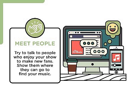 Meet people. Try to talk to people who enjoy your show to make new fans. Show them where they can go to find your music. Have them join your mailing list. You may even meet people who have skills and can help you further your career. Getting your music heard is all about connecting with people who want to support you. Be organized. Have a list of the people in the music industry you meet and what they do. Stay in touch. Maintain relationships with the people you meet in the industry. They’re more likely to help you spread your music if they feel like you like them.