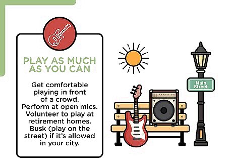 Play as much as you can. Get comfortable playing in front of a crowd. You’ll likely have to play a lot of non-paying gigs before you can land any playing ones. Perform at open mics. Volunteer to play at retirement homes. Busk (play on the street) if it’s allowed in your city.