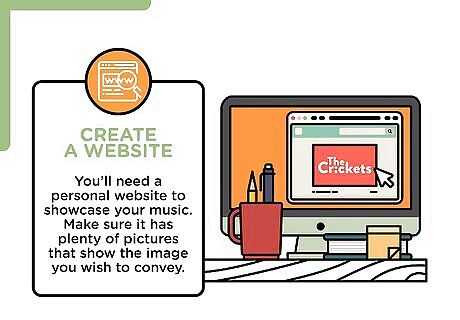 Create a website. You’ll need a personal website to showcase your music. Make sure it has plenty of pictures that show the image you wish to convey. Make sure your website looks professional. Your website should also have: A way for fans to download your music Performance dates where your fans can see you Videos of live performances if you have them A bio Contact information for people who want to hire you