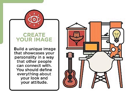 Create your image. Build a unique image that showcases your personality in a way that other people can connect with. Most rock stars have a slew of defining qualities that are specific to them. For example, Mick Jagger always wears tight, flashy clothes, sticks out his chest and explodes with energy to show he’s rebellious and doesn’t care what anyone thinks about him. You should define everything about your look and your attitude. Stay up to date with trends. You don’t have to follow them, but you should at least know what you’re choosing not to participate in. Magnify your strengths. Find out what people like about you and highlight it.