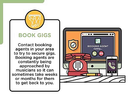 Book gigs. Contact booking agents in your area to try to secure gigs. Give them your demo and a link to your website so can hear your music and decide whether it fits their venue. Booking agents are constantly being approached by musicians so it can sometimes take weeks or months for them to get back to you. Remind them politely by email periodically that you’d still like to play at their venue. Be honest about your draw. Don’t say you can bring in more audience than you’re sure you can. When you do book a gig, always be on time and be respectful of the crew.