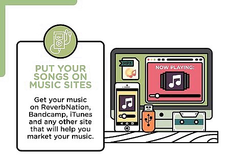Put your songs on music sites. Get your music on ReverbNation, Bandcamp, iTunes and any other site that will help you market your music. These sites are great places to get discovered by other musicians. Bandcamp even offers ways for fans to support your music with financial donations. ReverbNation offers inexpensive promotion for your music so more people can hear it.