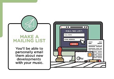 Make a mailing list. Whenever you play a show, encourage people to sign up for your mailing list. You’ll be able to personally email them about new developments with your music. Let them know when: You have a show You have new music coming out You have a collaboration with other musicians