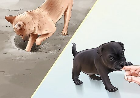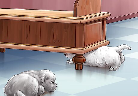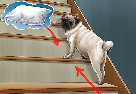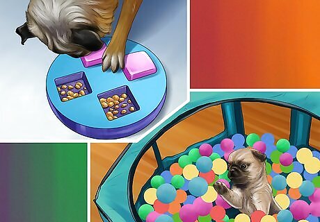 Create physical and mental challenges for your dog. Remember that small dogs can get exercise from simple activities that we often overlook. Have your dog run up and down the stairs with you for an easy work out. You could also create a climbing obstacle course by stacking cushions, pillows, and chairs for your dog to scramble on. You could also hide doggie treats around the house for your dog. This will motivate it to run around and explore its environment.