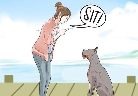 Teach your dog basic commands. It is particularly imperative that your dog should know “sit” and “stay.” You should also teach it the command “on boat” and off boat,” so that it will follow you when you are ready to get on and off boat. It is important to teach your dog “sit” and “stay.” That way, you can stop your dog when it is trying to jump into or drink the water, either of which can be dangerous.