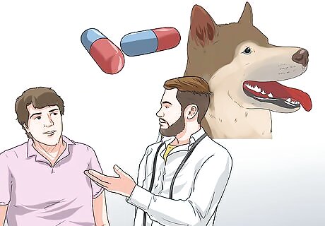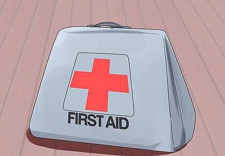 Bring a first aid kit. Bring any medications that your dog is on and antibiotic ointments in case it scratches itself. Full pet first aid kits can be purchased at most pet stores. A human first aid kit can also work, but you should keep some pet specific items on board: contact information for your vet, copies of important medical information including rabies vaccination, self-cling bandage, and a muzzle.