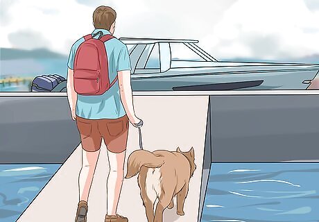 Slowly get your dog acquainted with the boat. Begin by bringing your dog out on the boat when you are at dock. Next time, try bringing him out to the dock, but turn the motor on to get him accustomed to the sound. Then, take him on a short boat ride and then progressively longer rides. This is important for getting your dog comfortable with the boat. It is also an opportunity to train your dog to be safe on the boat, teaching it commands and how to get on and off the boat. Short trips will also be a good opportunity to determine whether or not your dog gets sea sick. If so, you will need to buy medications that make your dog more comfortable.