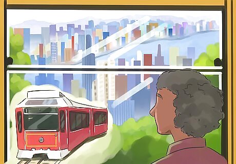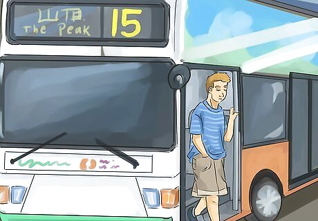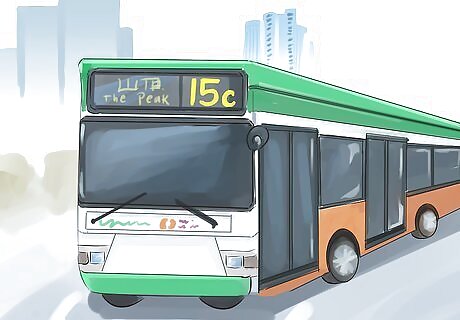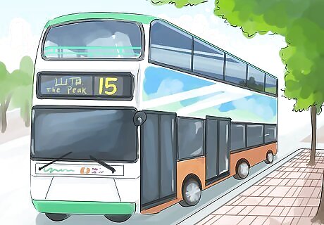 Ride the tram right to the top of Victoria Peak. The tram is a great transport option if you don't want to do much walking, as it takes you all the way up The Peak. Take a look at the Peak Tower building, the vast views, and the Galleria Shopping Arcade as you enjoy the ride. Board the tram at the marked boarding area. If you have a ticket, hand it to the driver. If you have an Octopus Card, scan it at the marked area. Don't worry about buying a ticket for the tram ride back to the city, as your initial ticket will include a return ticket unless you requested otherwise. Note that the tram goes down the hill backwards. If you think that you will find this scary, take the bus down the hill instead.
