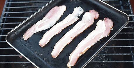 Place the bacon in a roasting pan. While you're waiting for the grill to warm up, lay your bacon strips over the grate in a roasting pan. This pan should consist of a metal grate that fits into a lower "grease catcher" with no holes in it. This allows the bacon to safely cook from the heat of the grill without dripping grease onto the bottom of the grill or burners. As an added bonus, roasting pans make for easy cleanup — just pour the grease out of the lower pan, wash the pan and the grate, and you're done!