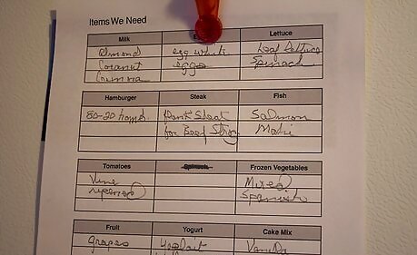 Track needed items by keeping a list in the kitchen. Write down needed ingredients as they are used during cooking. You may want to keep a separate list of items your family commonly uses - now all you have to do is make a check mark next to it instead of trying to read your or someone else's handwriting. "Milk, check. Cheerios, check."