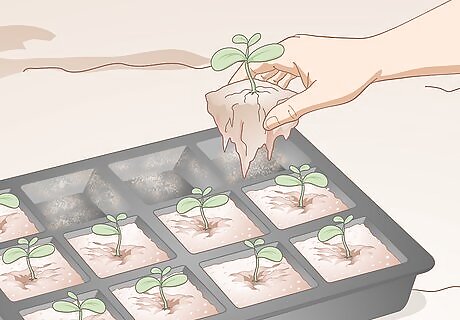 Plant seeds in a grow pack, if it is not yet 75 degrees Fahrenheit (24 degrees Celsius) outdoors. Although your seeds may be able to fertilize outdoors or in a container, cayenne peppers germinate best at a constant heat of 75 to 85 degrees Fahrenheit (24 to 29 degrees Celsius), which is often too hot for places that frost or even regular indoor temperatures. Soak your pepper seeds in a glass of water overnight. Fill your grow packs up to 1/2 inch (1.3cm) from the top of the back with commercial seed starting mix. Place 3 or 4 cayenne pepper seeds in each cell. Try to space them evenly. Cover with 1/4 inch (0.6cm) of seed potting mix. Moisten the soil. Cover the grow pack with plastic wrap. Place it on a sunny windowsill or on the top of the refrigerator to germinate. Dampen the soil when needed over the next 1 to 6 weeks. Thin your seedlings over the next few weeks. First snip off the weakest seedling when they get their first leaves. Cut off all but 1 seedling when they form 2 sets of leaves. This seedling should be ready to plant, once there is no risk of frost.