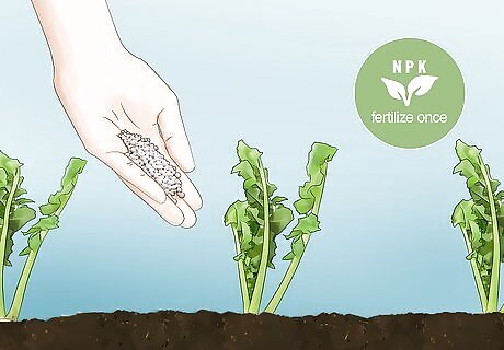 Give your winter vegetables just one application of fertilizer. Winter vegetables don't need regular applications of fertilizer to grow. Instead, apply a fertilizer to the soil when you're planting your vegetables and then avoid adding any more for the rest of the winter. Your vegetables will be able to survive the winter off of the initial application. Some organic fertilizers you can use are blood meal, bone meal, and cottonseed meal.