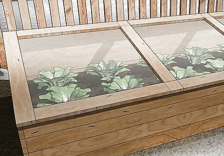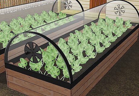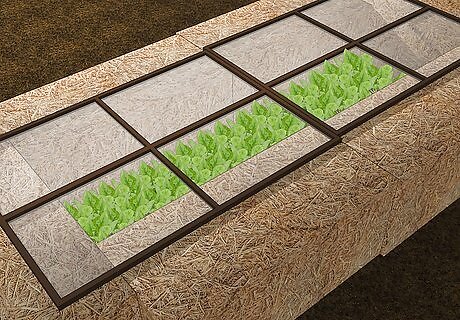 Build straw-bale cold frames to protect leafy greens and brassicas. Straw-bale cold frames are shelters made with straw bales that help insulate plants from the cold. To make your frames, surround your garden beds with straw bales so they’re closed off. Then, lay an old door, window, or piece of polycarbonate over the top of the bales or straw to seal the frame. To harvest the vegetables in your cold frames, just lift the top and pull out the vegetables inside. Make sure that your cold frame structure or greenhouse has proper ventilation to prevent the risk of overheating (even in the winter). The best cold frame structures have automatic openers that open and close on their own when it's hot or cold.