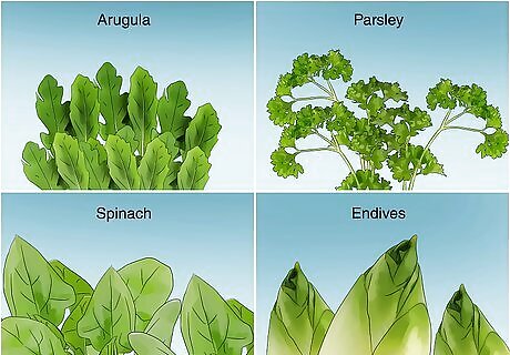 Grow leafy greens during the winter. Leafy salad greens are hardy and capable of withstanding cold temperatures and frosts. To grow leafy greens for a winter harvest, plant them in the ground during the fall. Some leafy greens you can try growing are: Arugula Parsley Spinach Endives Pro tip: You want to start your winter vegetables in the late summer or fall to get a head start on the winter, and get your vegetables established when there's still sun in the sky. Starting your winter garden too early in the summer will result in greens or vegetables maturing too early before winter.