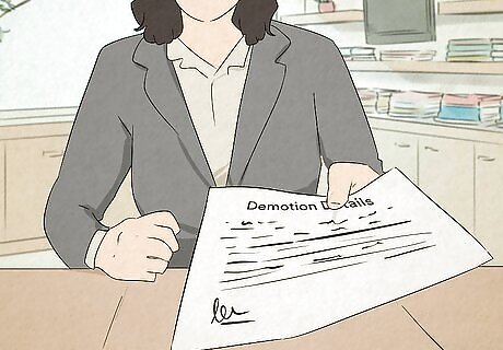 Appeal the decision internally if you can show it is unjust. Many organizations have an internal mechanism in place for appealing decisions such as firings and demotions. If your company has such an option in place, there are times when this might be the right path for you to consider, such as: You truly believe that the demotion is unjust due to misinformation. You have evidence that the demotion is directly due to discrimination of some sort from the supervisor demoting you. You want the chance to challenge the decision and plead your case.