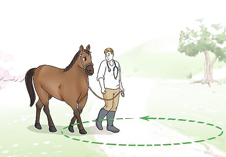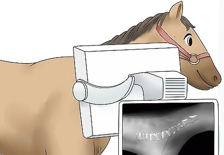 Have your vet perform preliminary tests. Before you put time and money into medical tests for wobblers, you may request your vet conducts some preliminary tests. Alternatively, you could start by asking for a simple lameness test. Tests such as having the horse turn in a small circle or trying to sway them to one side will help your vet make a preliminary diagnosis. In a sway test, you may need to assist your vet. One of you will lead the horse, while the other tries to change their position by redirecting their tail. A normal horse will correct itself while a horse with wobblers will move in the direction it is pulled and will often stumble.