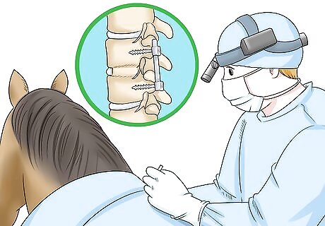 Consider spinal surgery. While conservative management works for some horses, many end up needing spinal fusion surgery. This will need to be done by a specialist under general anaesthetic. Recovery will require a compression bandage and plenty of time in a dark, quiet stall. Your vet will help you monitor aftercare and let you know when your horse is ready to have the bandage removed, as well as when they are ready to start training again. The exact amount your horse can exercise after its sixty to ninety day recovery period depends on a number of factors including how advanced their condition is.