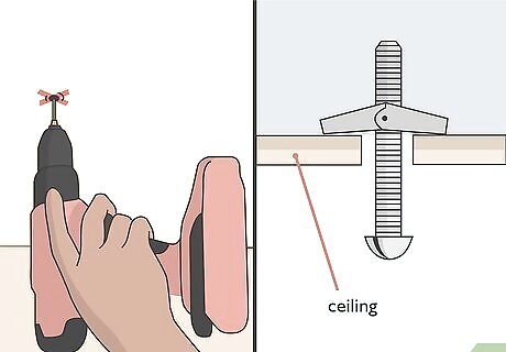Drill toggle bolts into the ceiling at the marked locations. A toggle bolt, also known as a butterfly anchor, is a fastener that’s used to hang objects on hollow walls. Take a power drill and attach a drill bit that fits the toggle bolt. Place a toggle bolt onto the bit and hold it against 1 of the marked locations on the ceiling. Drive the bolt into the ceiling leaving a ⁄2 inch (1.3 cm) gap between the end of the bolt and the surface. Install the rest of the toggle bolts into the marked locations on your ceiling. Leave a small gap so you can easily fit the brackets onto the toggle bolts. You can buy toggle bolts at studio equipment stores, at home improvement and hardware stores, or by ordering them online. Because the toggle bolts can be adjusted and tightened, you can use any type to fit your brackets.