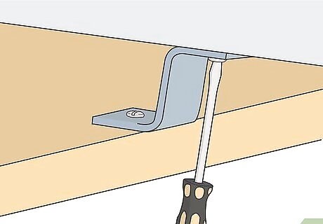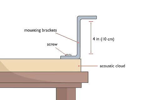 Screw 4 in (10 cm) mounting brackets to the frame of the clouds. Place 1 of the brackets with the screw hole opening against the frame on the underside of the acoustic panel. Hold it in the center of 1 of the long sides of the panel and use wood screws and a screwdriver or power drill to attach it to the frame. Then, install another bracket across from it on the other side of the frame, facing in the same direction. Use your ruler or tape measure to make sure the brackets are installed so they line up evenly across from each other. A 4 in (10 cm) gap between the acoustic cloud and the ceiling will help diffuse sound waves and reduce low bass notes. You can purchase mounting brackets and wood screws at studio equipment stores, at your local hardware store, or by ordering them online.