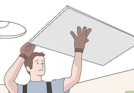 Slide the brackets onto the toggle bolts. Take 1 of the acoustic clouds and carefully climb up the ladder with it. Align the brackets on the cloud panel with the toggle bolts on the ceiling. Slide the opening on both of the brackets onto the 2 toggle bolts. If you have other acoustic clouds, slide them onto the toggle bolts on the ceiling. Make sure you slide the brackets all the way onto the toggle bolts so they’re centered.Tip: If you’re having trouble lining up the brackets and toggle bolts, have a friend help you.