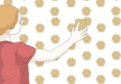 Wet a sponge and wash off excess paste from the patterned side of the wallpaper as needed.