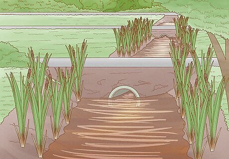 Look for cattails in marshy areas. Cattails grow in wet, marshy areas such as along the edge of a pond or a stream. You can find them in wet ditches, as well as bioswales and other marshy spots. Habitats include wet thickets, swamps, ditches, moist fields and other wetlands.