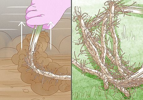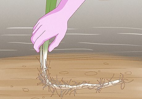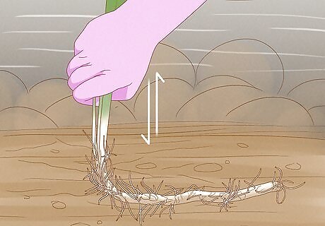 Locate the roots. The roots or “rhizomes” of the plant need to be loosened up, but first you need to find them. Use your hands to follow the stalk or shoot of the plant until you get to the base of the plant, which will likely be in the mud. Feel for one of the branches of the root system.
