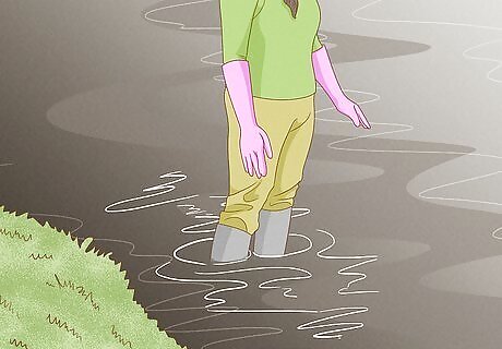 Put on your gloves and boots. Walk out into the marshy crop of cattails. Since cattails grow in wet, marshy areas, you may want to wear rainboots or waders. You could also go barefooted, although you should assess risks like cutting your feet on broken glass. Gloves are also a good idea, since you will be working in the muck. If you go barefoot, it might be a bit cold. A risk of going barefoot is cutting your feet on bottles, rocks or other sharp objects. If you go barefoot, you could easily sprain your ankle on one of the plants. Ticks and leaches are a concern in some areas and seasons. If it is tick season, you should definitely avoid going barefoot.