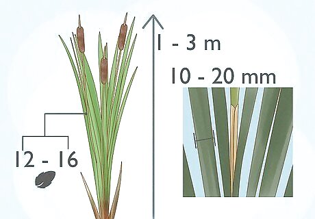 Look at the thick, linear leaves. The leaves are long and flat, typically measuring one to three metres in length. You will see twelve to sixteen leaves on each cattail shoot. The cross section of a leaf is D-shaped and between ten and twenty millimeters in width.