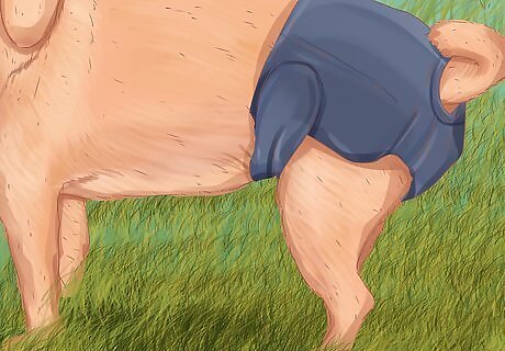 Put diapers on your dog. Pet stores carry doggy diapers that can fit animals in a variety of weight ranges. These diapers are often cloth with a liner or pad insert. You can also buy human disposable diapers and then modify them to fit your dog by folding the sides and cutting a tail hole. Boys’ or girls underwear can work as a make-shift diaper as well, just make sure to insert a pad and account for your dog’s tail. Make sure to change your dog’s diaper every two hours or so, or whenever you know it is soiled. Failing to regularly change their diaper could lead to your dog developing a rash or urine scalding. Be aware that not all dogs like to wear diapers and many will try to claw them off. You might want to test the waters with a cheap disposable pair.