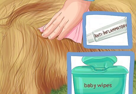 Clean your dog’s groin area regularly. Use a baby wipe or a warm wash cloth to wipe down your dog’s upper thigh and genital areas after each accident. This is especially important to do with an older dog who may not be able to clean itself. You can also apply an anti-inflammatory cream to irritated areas. This extra care will help to prevent urine scalding, where a dog’s urine literally burns its skin. Regular cleanings can also make it less likely that your dog will suffer from a secondary bladder infection.
