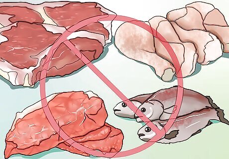 Stop eating meat. Over 99 percent of commercial animal products come from factory farms. At these large industrial operations, animals are often neglected, abused, or left to live in cramped and/or unsanitary cages. One of the best ways to help reduce animal suffering is to give up meat by becoming a vegetarian or give up all animal products by becoming a vegan. Even dairy and egg production can cause suffering for animals. Chickens and cattle are forced to produce more eggs and dairy (respectively) than they naturally would, all while being housed in cramped, uncomfortable living quarters. Additionally, many chickens have their beaks cut off or burned off to reduce the chances of "nervous pecking" in the tightly-packed cages. If you're not sure you want to commit to a meat-free diet, try participating in meatless Mondays. It's a great way to try out a meatless diet one day each week and experiment with different meal options that you may not otherwise have tried. There are a plethora of vegetarian and vegan recipes available online and in printed cookbooks. Learn how to make delicious vegan meals at home, or find restaurants that offer vegetarian/vegan versions of your favorite dishes.
