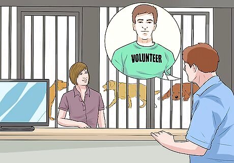Apply to be a volunteer. Many shelters and rescue groups are in dire need of volunteers, and will provide training for you once they approve your application. To be sure that you meet the volunteering requirements of your local shelter or rescue organization before applying, call for information or visit their website to see if you fit the criteria. Volunteers can be in charge of many tasks, including walking dogs, teaching basic obedience, moving dogs in and out of their cages, cleaning, and meeting with potential adoptive owners. For instance, the Animal Humane Society, the leading animal welfare organization in the Upper Midwest, outlines on its website that it requires applicants to be at least 16 years old, willing to commit to a full year of volunteering (at least once every other week), and be able to lift up to 20 lbs. If you can't commit to volunteering regularly, offer your services at busy times of the year, like around the holidays, when the staff members may want to take breaks to be with their families.