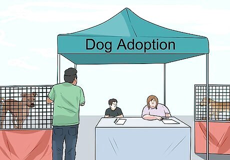 Host an adoption event. To hold an adoption drive, approach one or more local shelters or rescue groups and see how many adoptable dogs you will be dealing with. Pick a date and time, find a venue, plan a budget, and purchase necessary supplies (e.g. folding tables and chairs, trash bags and trash cans, cleaning supplies). Ask local business owners for contributions to the event, ask the rescue organizations for flyers or advertising templates, and share the event with the public on social media. Recruit volunteers for the event through social media, word of mouth, flyers, and by contacting large organizations (e.g. church groups, volunteer organizations, schools).