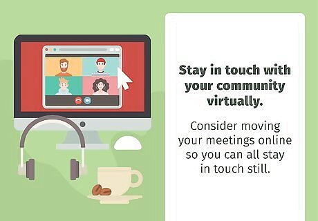 Stay in touch with your community virtually. If you are a member of a club or a community group, consider moving your meetings online so you can all stay in touch still. Try to stay involved with your community without breaking the social distancing guidelines. Zoom and Skype can both host multi-person video calls.