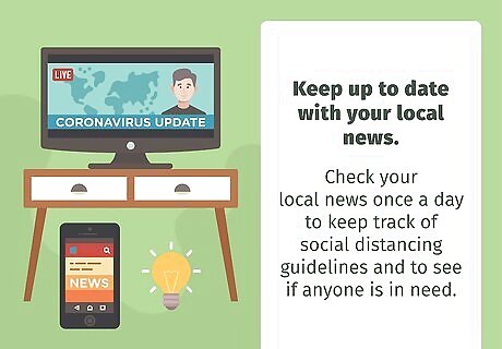 Keep up to date with your local news. The situation surrounding COVID-19 is changing rapidly, and the expectations for you and your community may change along with it. Check your local news once a day to keep track of social distancing guidelines and to see if anyone is in need.Tip: It’s fine to take a break from the news every now and then if you need to. Stay informed, but don’t overwhelm yourself.