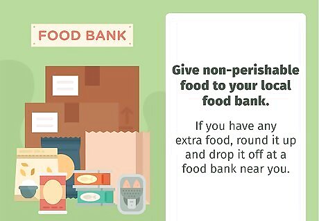 Give non-perishable food to your local food bank. Canned food, nuts, nut butter, dehydrated food, bottled water, and sports drinks are all needed at food banks to give out to the community. If you have any extra food, round it up and drop it off at a food bank near you. Call the food bank ahead of time to make sure they are open.