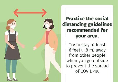 Practice the social distancing guidelines recommended for your area. Try to stay at least 6 feet (1.8 m) away from other people when you go outside to prevent the spread of COVID-19. Check in with your local mandates often to see if those guidelines change. As of April 2020, the Center for Disease Control has recommended that everyone wear a cloth mask when they are out in public.