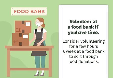 Volunteer at a food bank if you have time. Since people are staying home, there are less volunteers to run food banks. If you are able to, consider volunteering for a few hours a week at a food bank to sort through food donations. You can also volunteer to drop off food at people’s homes if they cannot leave their house.