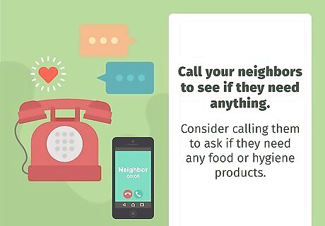 Call your neighbors to see if they need anything. Elderly people and those with weakened immune systems are more at-risk for COVID-19, so they are probably staying in their homes more. If you have any neighbors who can’t leave their homes, consider calling them to ask if they need any food or hygiene products. You can drop off any food or products at your neighbor’s door to avoid social contact.