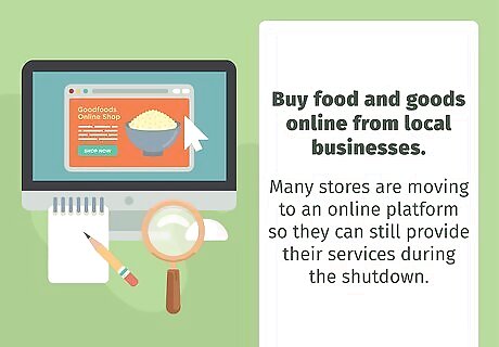 Buy food and goods online from local businesses. Many stores are moving to an online platform so they can still provide their services during the shutdown. If you would like to order takeout or purchase something that a local business sells, search online or give them a call to see how you can buy it from them. Unfortunately, some businesses have had to close during the shutdown. If you can’t find a business online or by calling them, they may not be open.