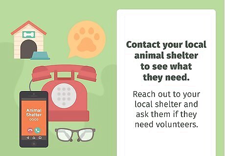 Contact your local animal shelter to see what they need. Many animal shelters do not have the volunteers that they need right now to keep their organizations running. If you can, reach out to your local shelter and ask them if they need volunteers.Variation: If you have the room, consider fostering animals that are up for adoption by keeping them in your home until they find a permanent place to live.